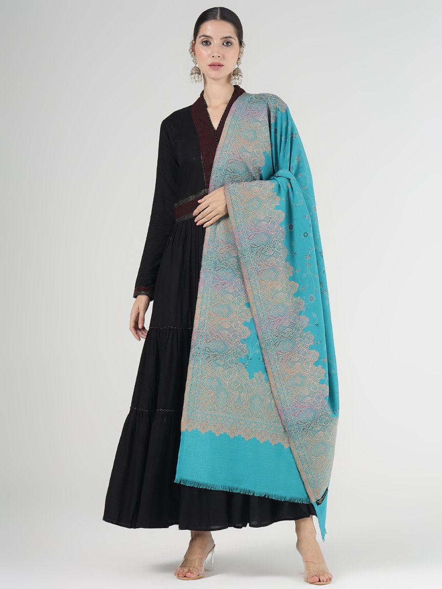 Faux Pashmina Traditional Jamawar Jaal Shawl - Icy Blue