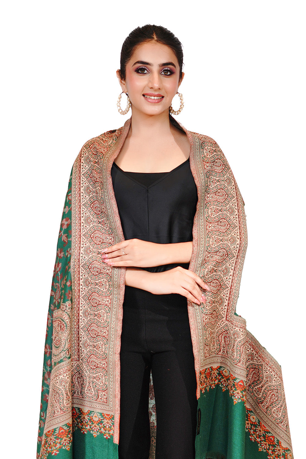 Faux Pashmina Traditional Jamawar Jaal Shawl - Forest Green