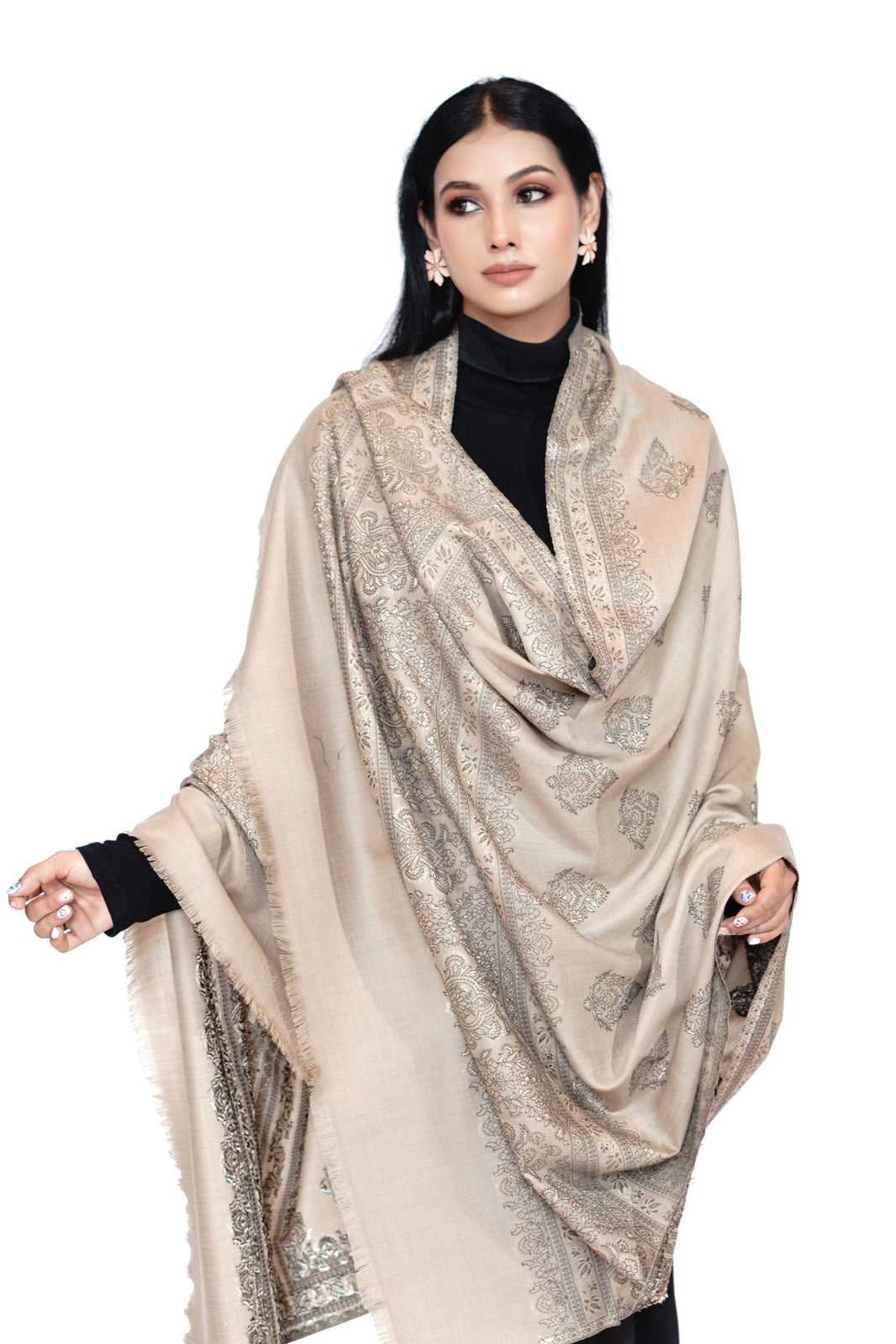 Women's Traditional Woollen Jamawar Shawl with Zari Work- Ivory Elegance | Ultra Soft & Warm