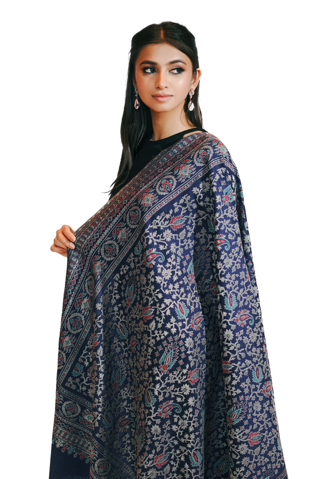 Women's Traditional Woollen Jamawar Shawl with Zari Work- Imperial Indigo | Ultra Soft & Warm