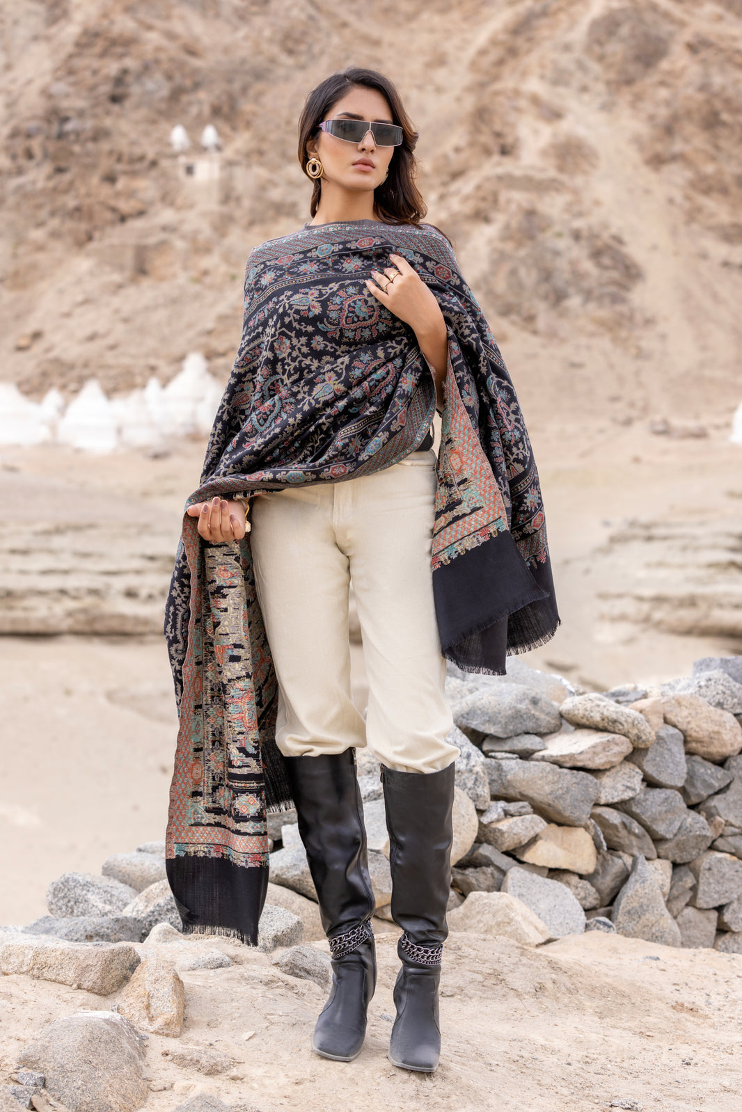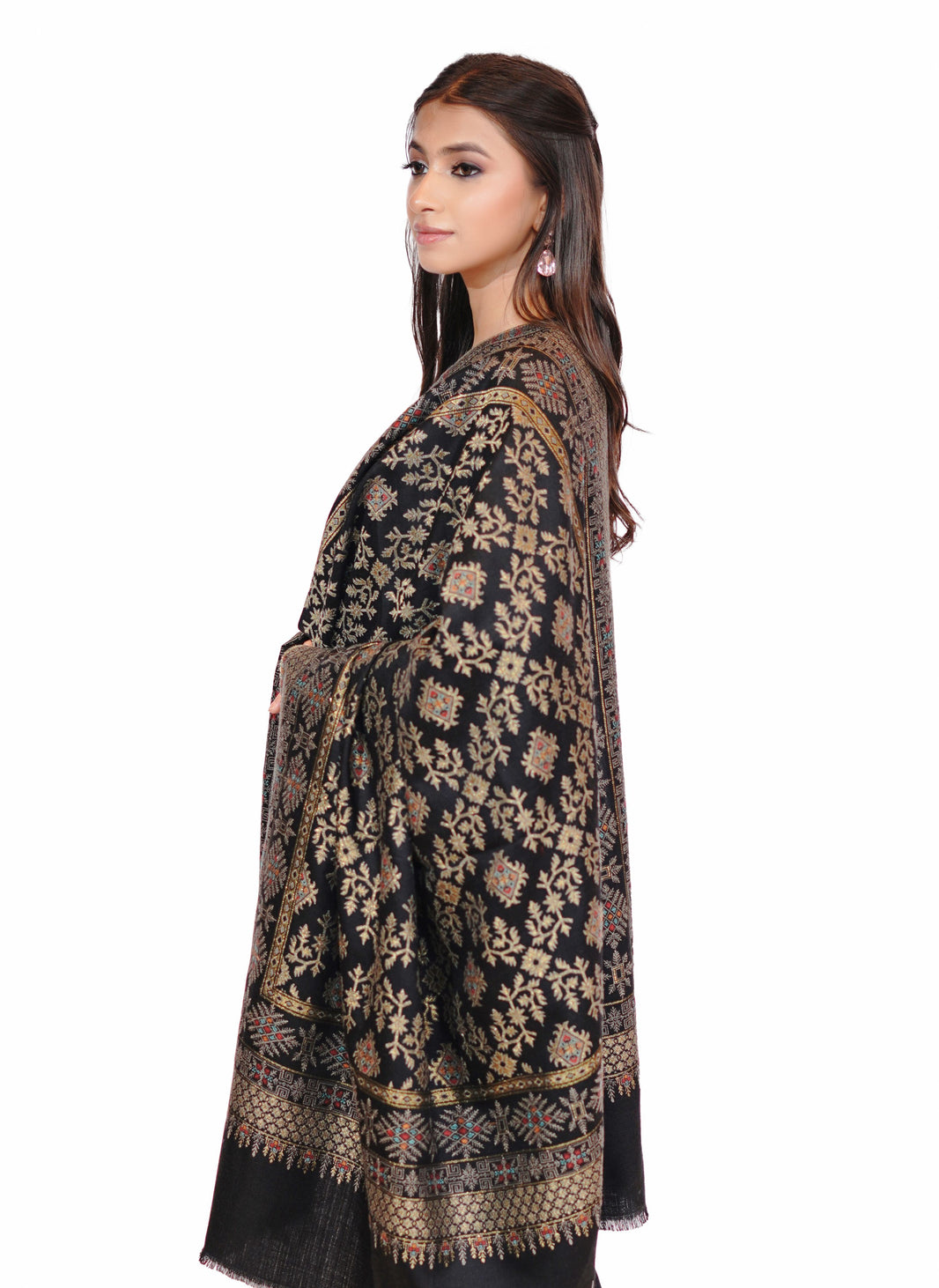 Women's Traditional Woollen Jamawar Shawl with Zari Work- Classic Black | Ultra Soft & Warm