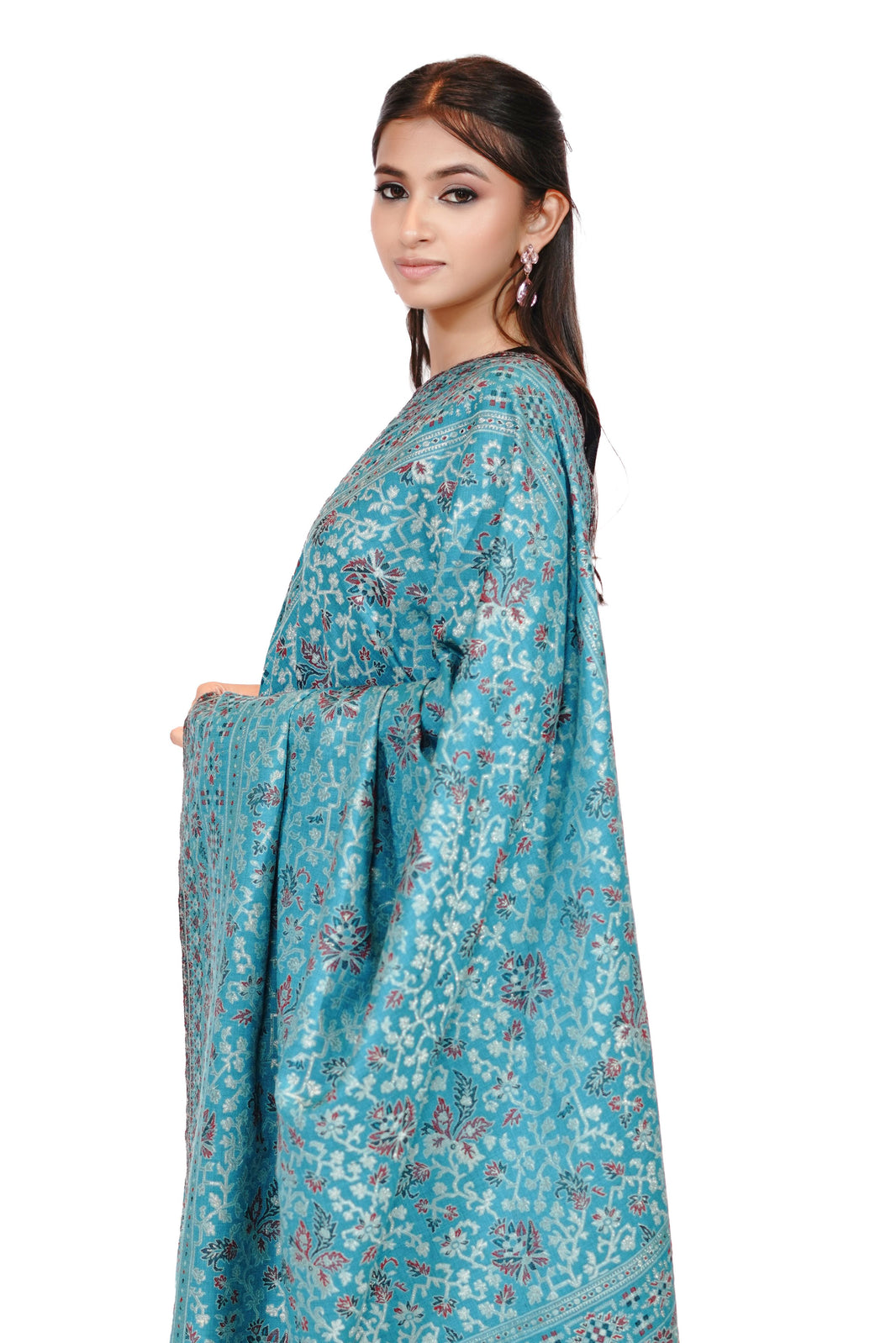 Women's Traditional Woollen Jamawar Shawl with Zari Work- Turquoise Treasure | Ultra Soft & Warm