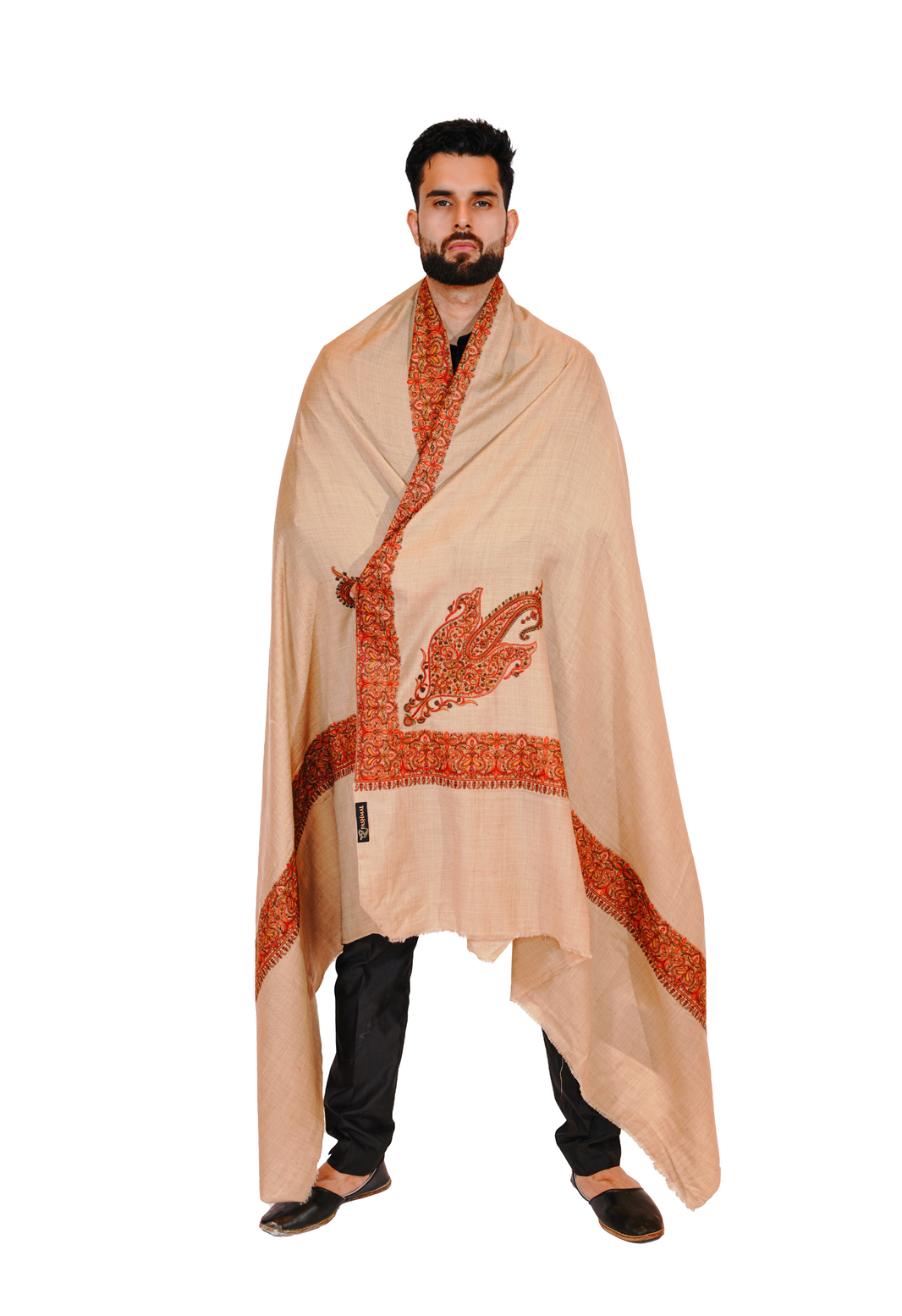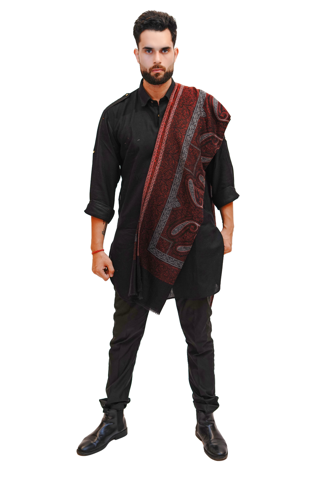 Hand-Embroidered Wool Blend Shawl for Men – Creamy Crimson/Bare luxury | Full Size, Extra Soft & Warm