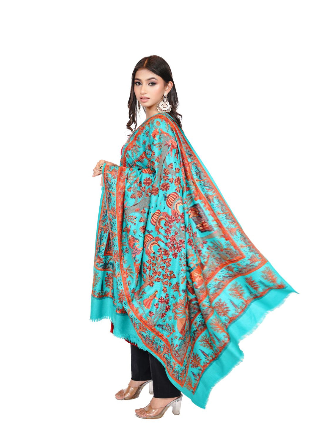 Heritage Mughal Darbaar Woollen Shawl for Women - Sky Blue | Full Length, Extra Soft Wool
