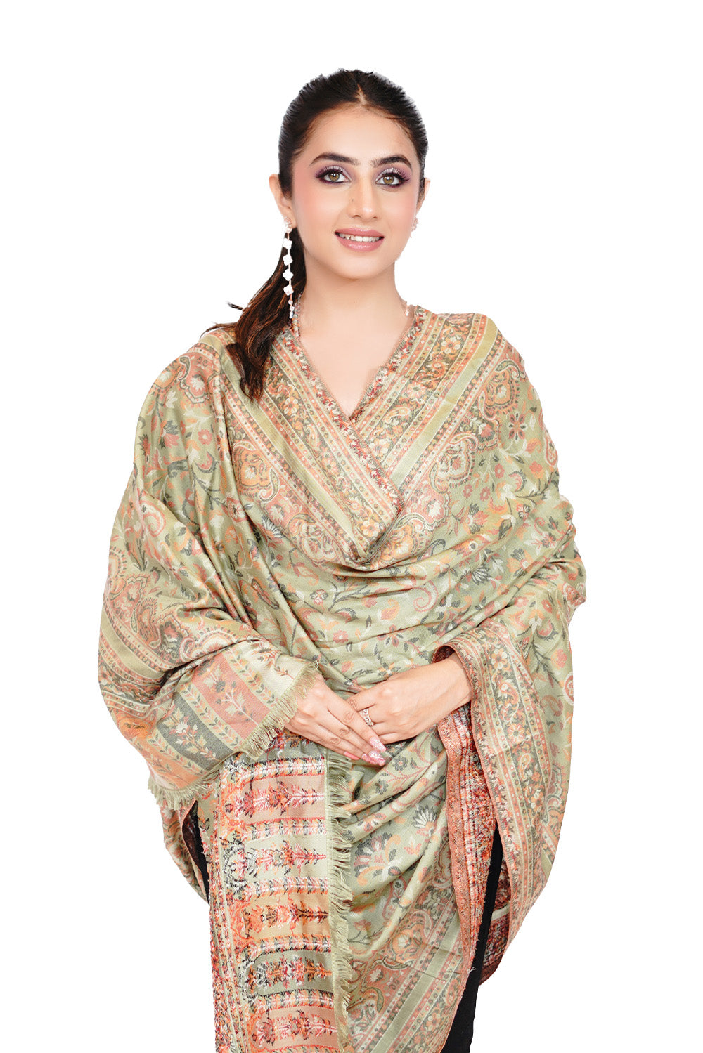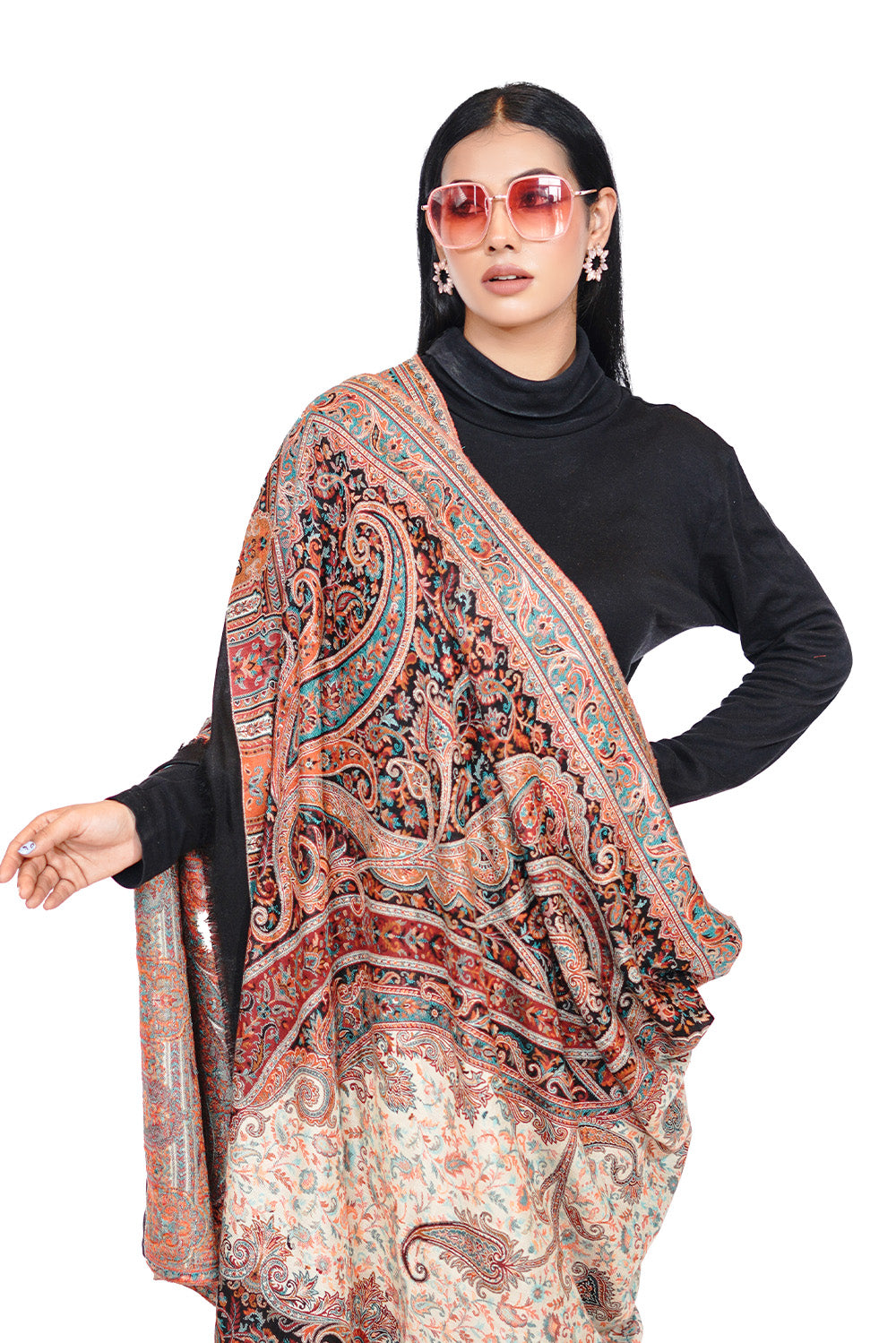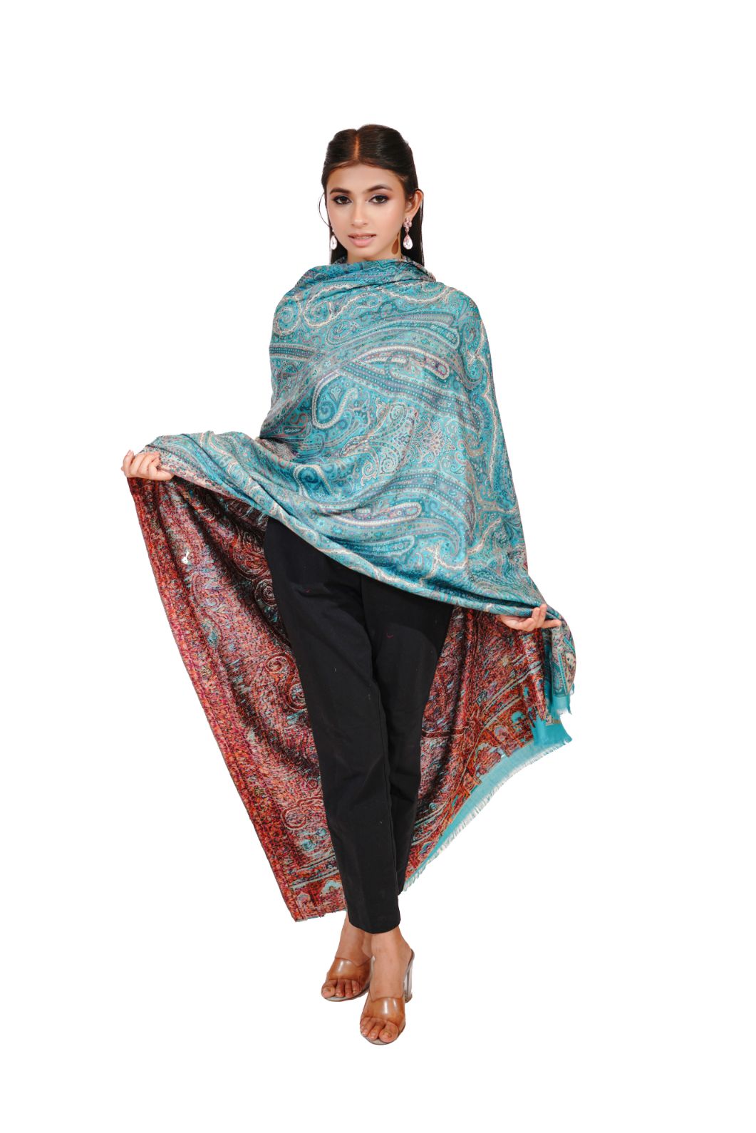 Printed Shawl with Aari Embroidery for Women - Pasiley Motifs | Full Length, Extra Fine Wool