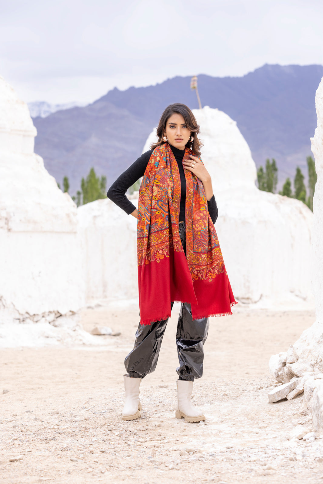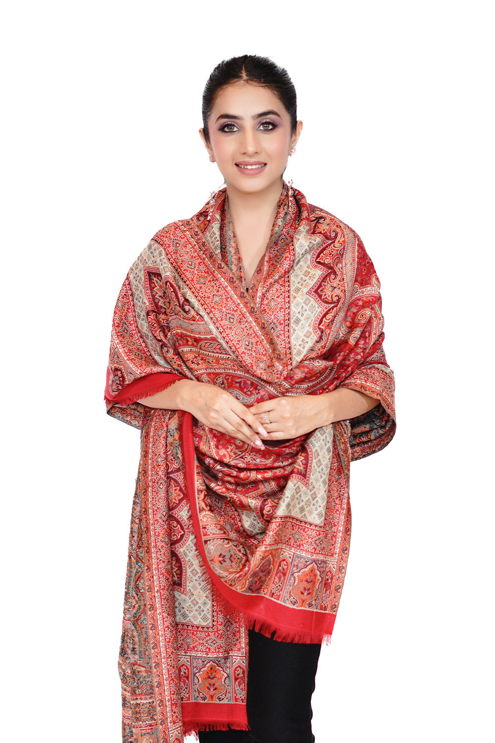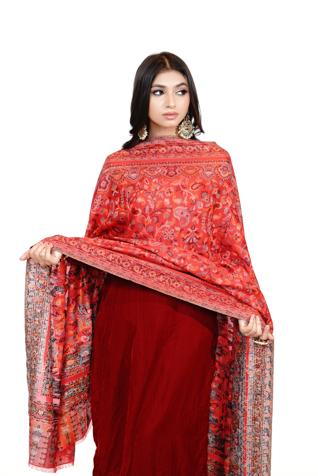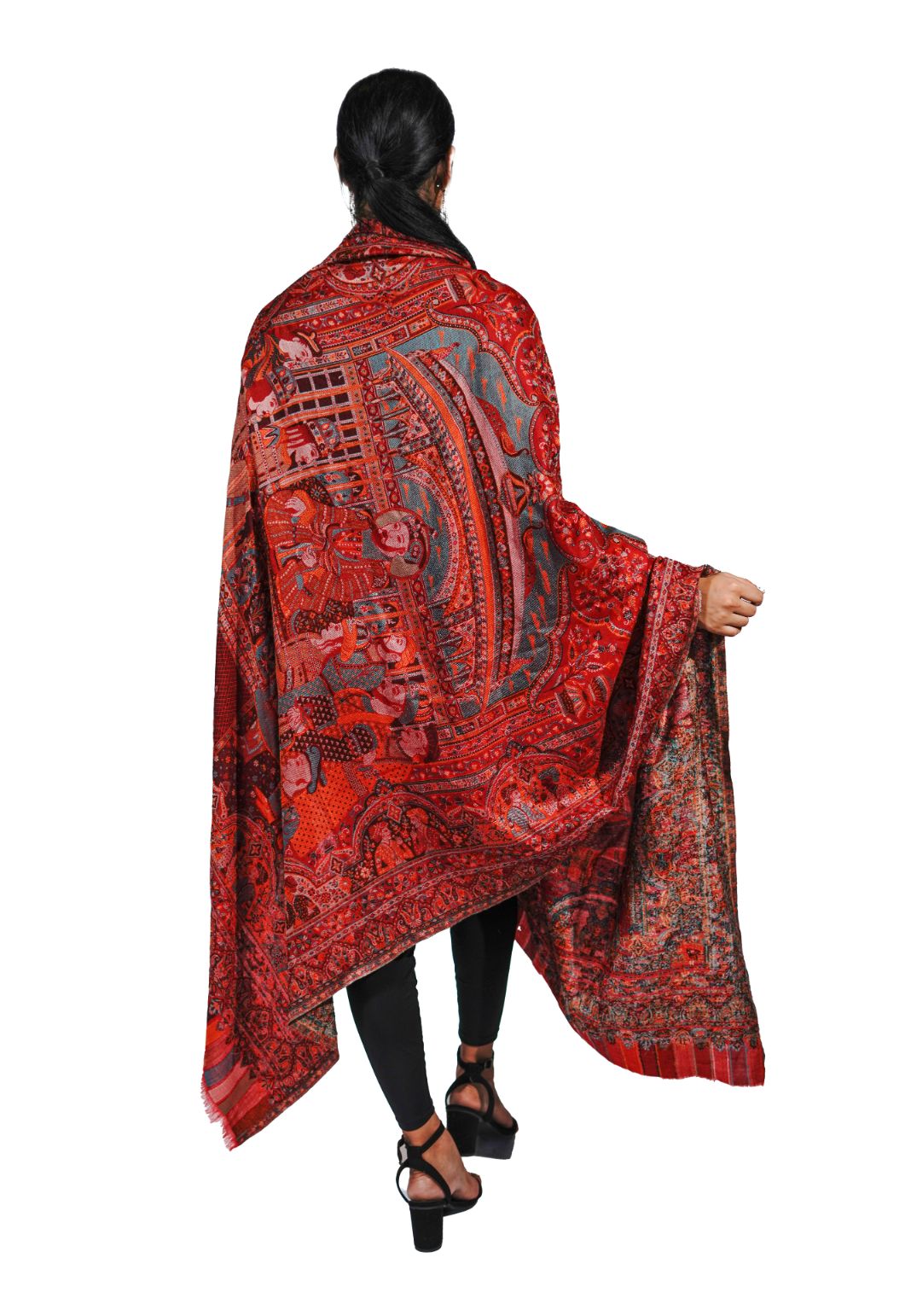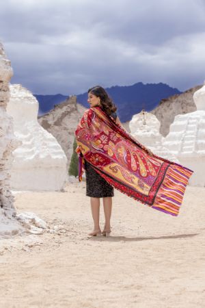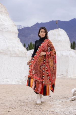 Heritage Mughal Darbaar Woollen Shawl for Women - Regal Red | Full Length, Extra Soft Wool