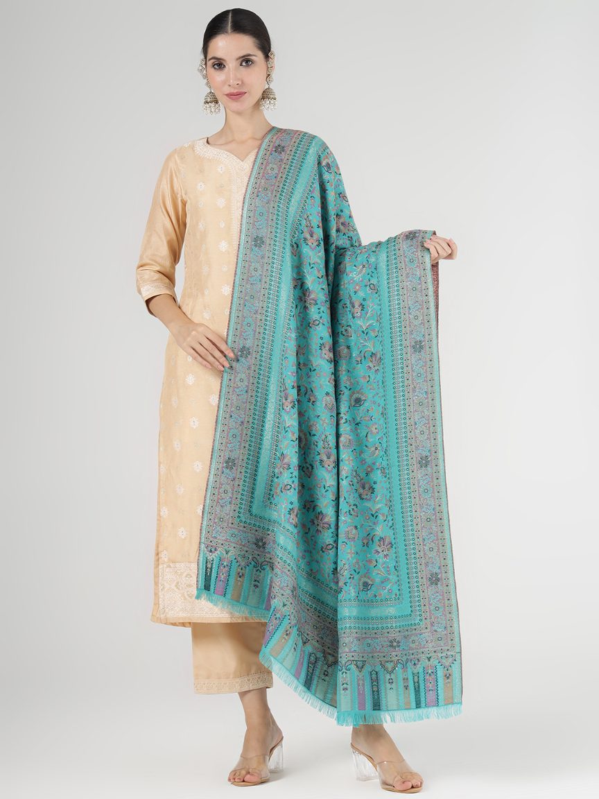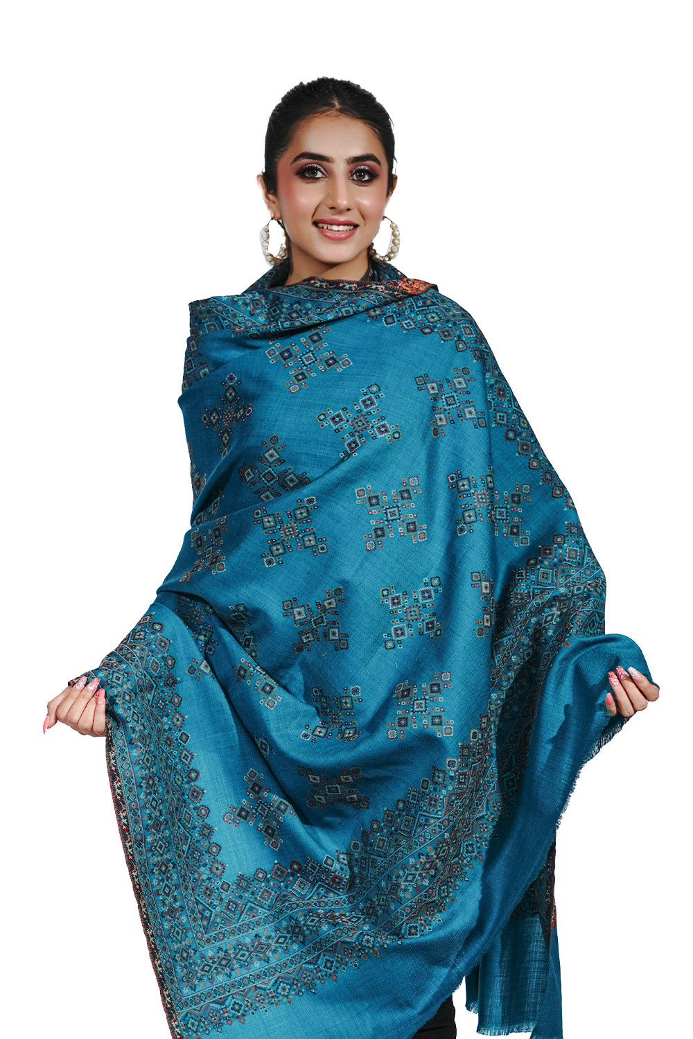 Wool Blend Traditional Jamawar Kani Shawl for Women - Shimmering Blue | Full Size, Soft & Warm